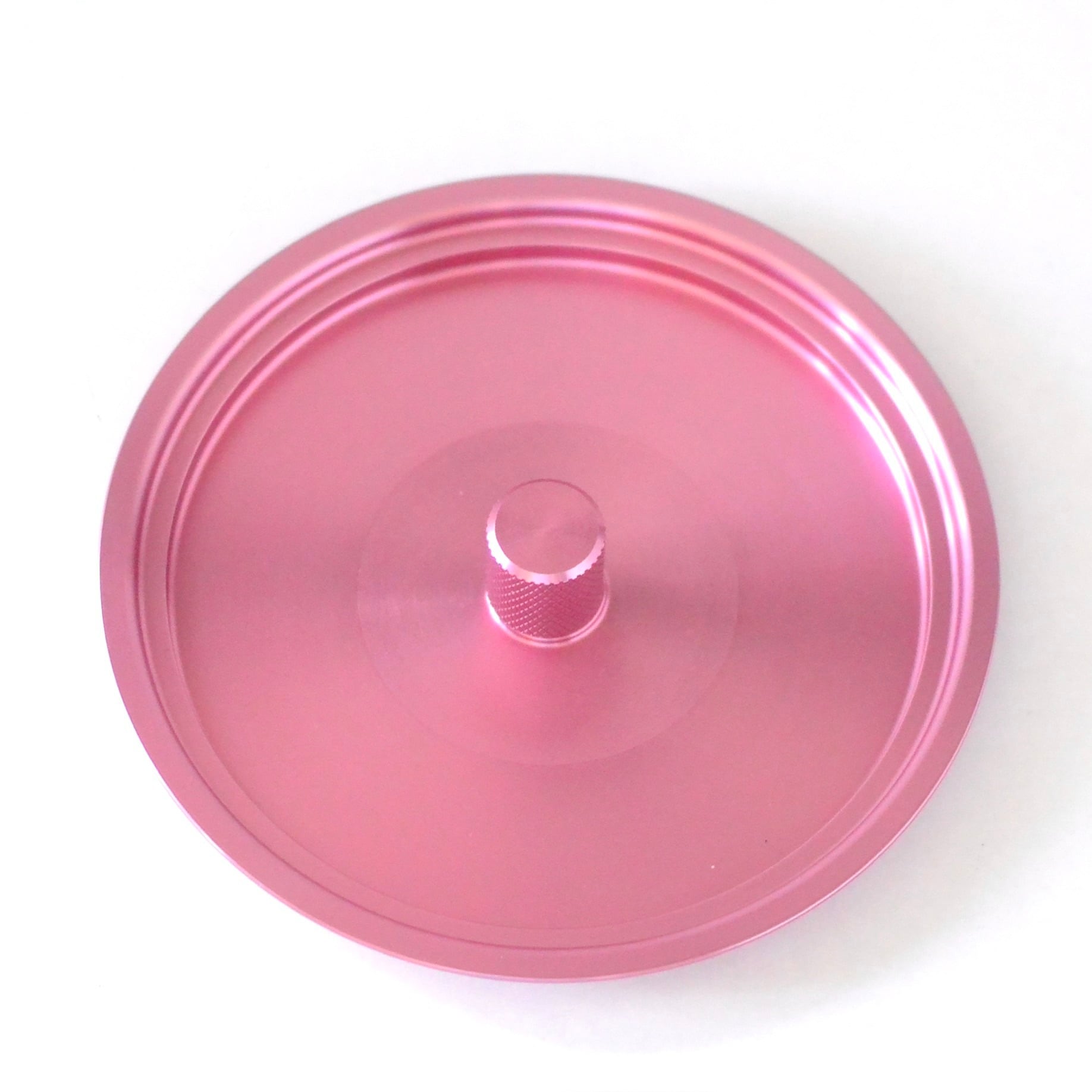 取っ手は通常モデルのコルクと異なり、ピンクアルマイトのアルミ削り出しローレット加工版が標準搭載されております。フタの熱が取っ手に直接伝わらないようにプラリングを挟みました。