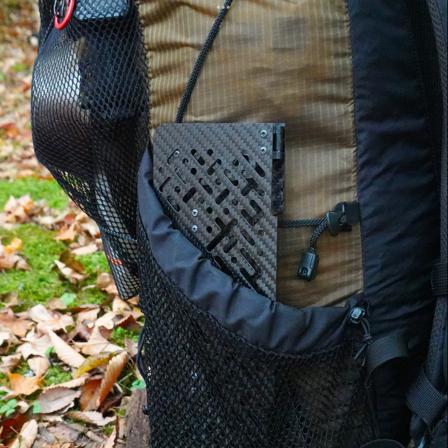 縦型に折りたためることでバックパックのサイドポケットに入りますので、